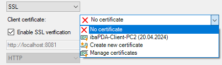 The SSL communication requires certificates. You can store and manage certificates in the central certificate store in ibaPDA . Detailed information about the certificate store can be found in the ibaPDA manual.