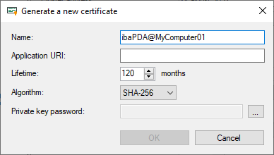 Create new certificate: ibaPDA creates a new self-signed certificate. Enter the necessary settings in the opening dialog. When the certificate is successfully created, the new certificate is selected.