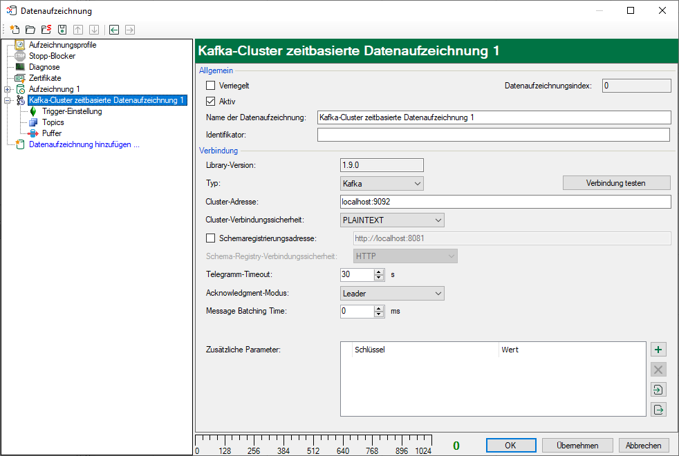 Dieses Kapitel beschreibt die Konfiguration der Kafka-Cluster zeitbasierten Datenaufzeichnung. Die Konfiguration der Topics nehmen Sie im Unterknoten Topics vor, siehe Konfiguration der Topics.