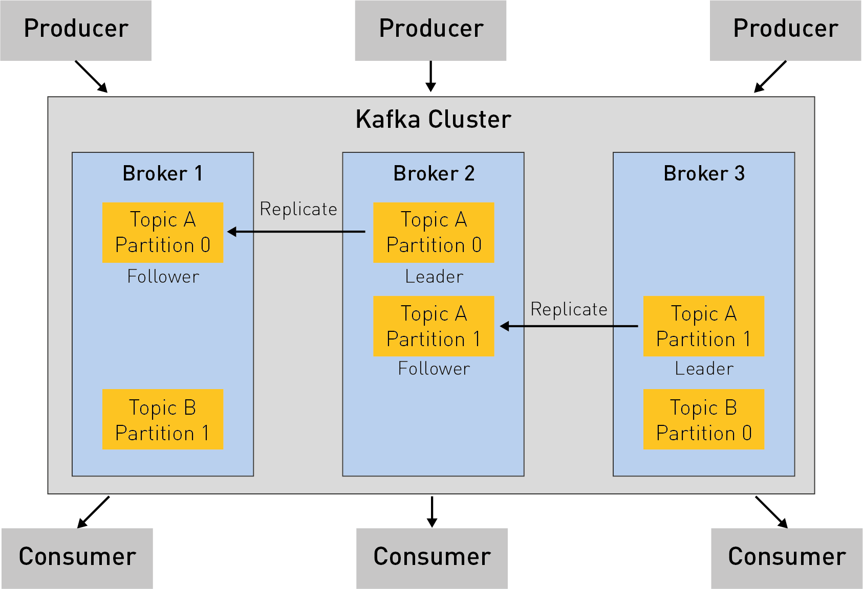 Topics können in mehrere im Cluster verteilte Partitionen aufgeteilt und repliziert werden. Als Producer sind Anwendungen, die Nachrichten in einen Kafka-Cluster schreiben. Dabei werden die Nachrichten an den Leader gesendet, die Replikation mit den Followern erledigen die Broker untereinander. Consumer sind Anwendungen, die Nachrichten vom Kafka-Cluster lesen.