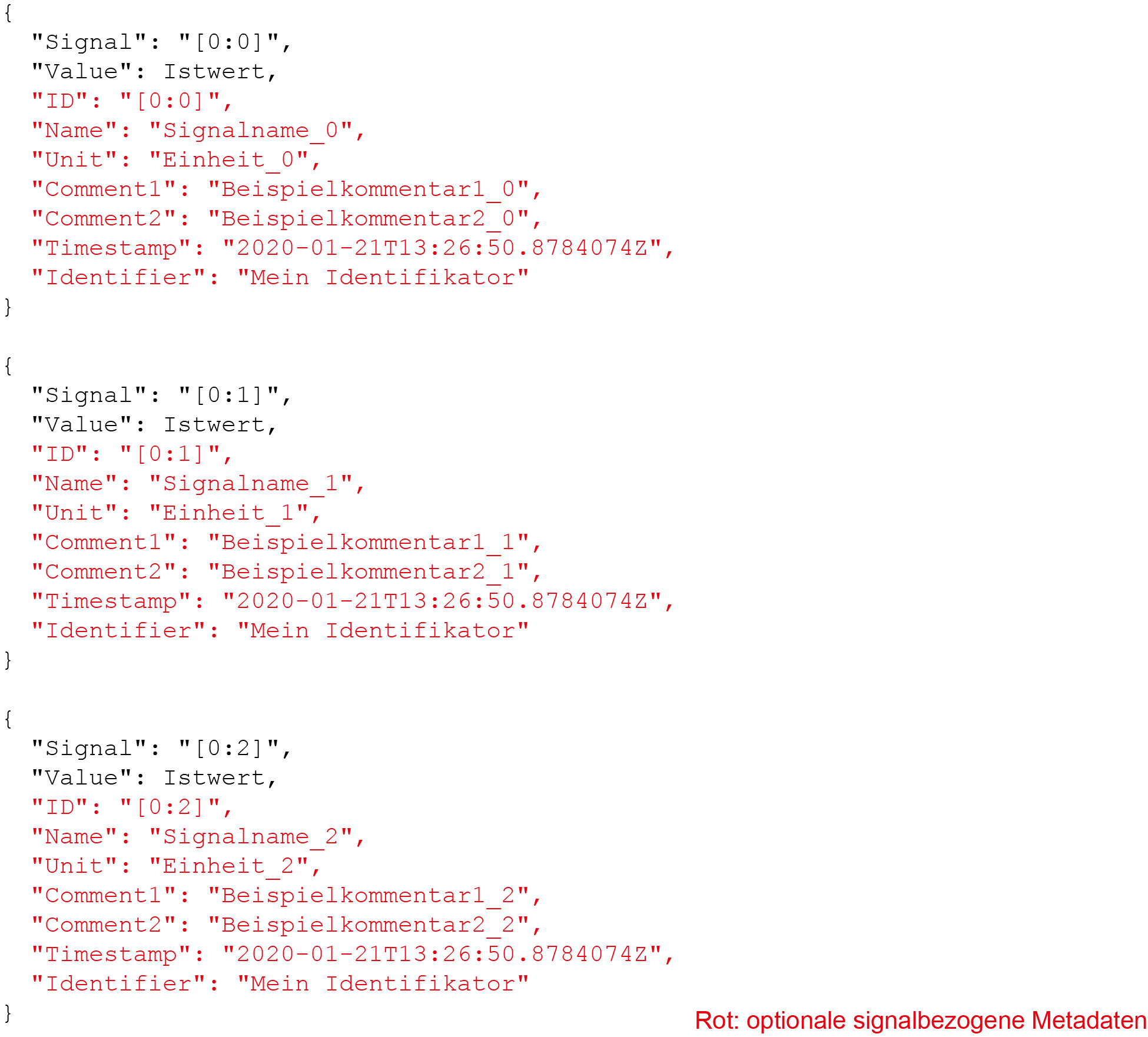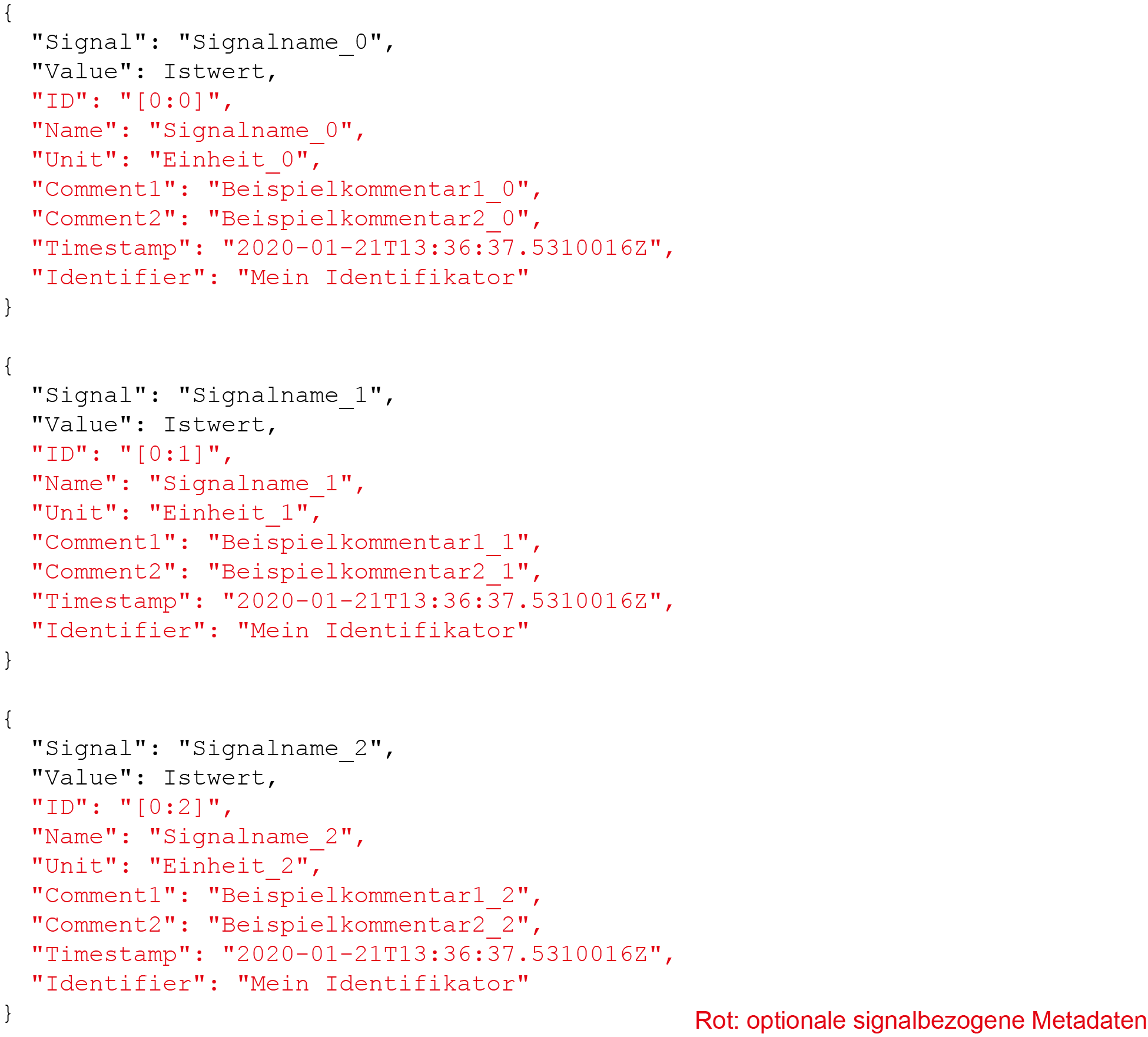Im Folgenden wird der Aufbau des Datenformats "JSON (pro Signal)" anhand eines Beispiels mit drei Signalen erläutert. Die Signale sind wie folgt definiert: