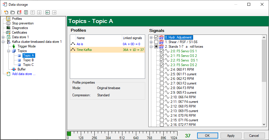 In the example above, a maximum of 1024 signals can be written via Kafka data stores. Currently 37 signals are enabled.