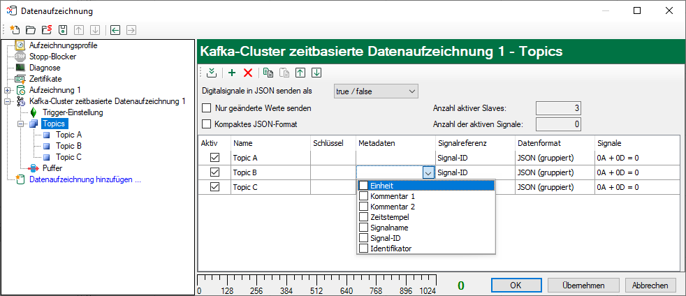 Im folgenden Dialog ordnen Sie die gewünschten Signale unter Nutzung der Aufzeichnungsprofile den Topics zu. Siehe Kapitel Signalauswahl.