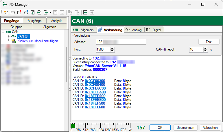 Im Register Verbindung konfigurieren und testen Sie die Verbindung zum jeweiligen CAN-Gateway.