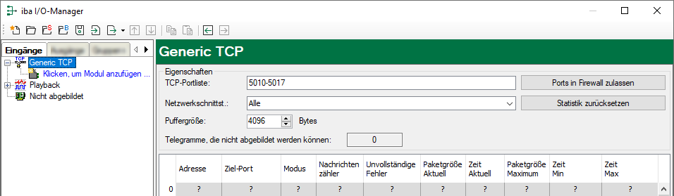 Ports, auf denen ibaPDA auf ankommenden Verbindungsaufbau wartet. Sie können die Portnummern als Bereich oder als Aufzählung oder beides kombiniert eingeben. Geben Sie einen Bereich mit einem Bindestrich ein und trennen Sie nicht aufeinander folgende Portnummern durch Kommas. Standard ist der Bereich 5010 – 5017. Die Portnummer im Controller muss identisch sein (siehe Konfigurieren des Controllers).