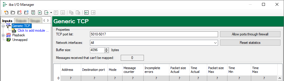 The list is only valid for the "passive" mode. It contains the port numbers on which ibaPDA is waiting for a connection set-up by the "active" partner. For active connections, ibaPDA can use port numbers that cannot be found in this list. These port numbers need to be enabled in the firewall of the connection partner. |