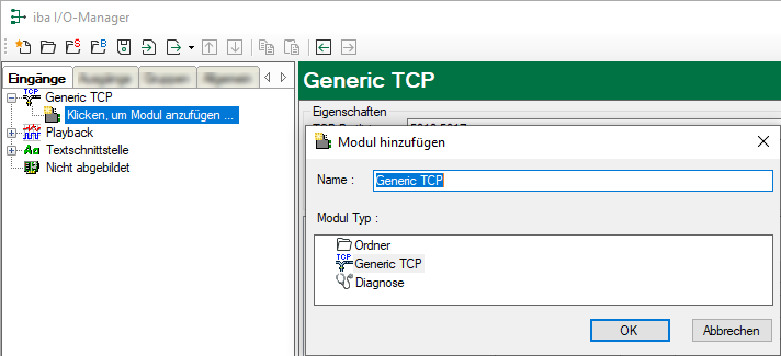 Mit der automatischen Erkennung wird für jede Verbindung ein Generic TCP-Modul mit 32 analogen Signalen (Datentyp FLOAT) und 32 digitalen Signalen angelegt. |