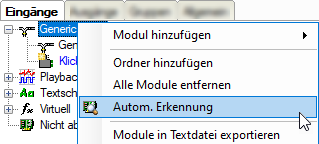 Zyklische TCP/IP-Telegramme, deren Ziel-Port im TCP-Port-Bereich der Schnittstelle liegen, werden automatisch in der Verbindungsliste angezeigt, auch wenn keine entsprechenden Module definiert sind und ibaPDA nicht gestartet ist. Für diese Verbindungen können Sie auf einfache Weise Module anlegen, indem Sie in der Baumansicht mit der rechten Maustaste auf die Schnittstelle Generic TCP klicken und im Kontextmenü Autom. Erkennung wählen.