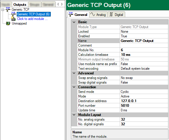 If you want to configure an output module, mark the module in the tree structure of the Outputs tab.