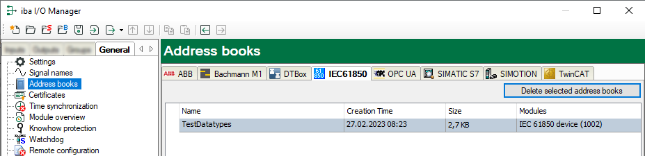 The IEC 61850 address books are listed in the General tab of the Address books node.