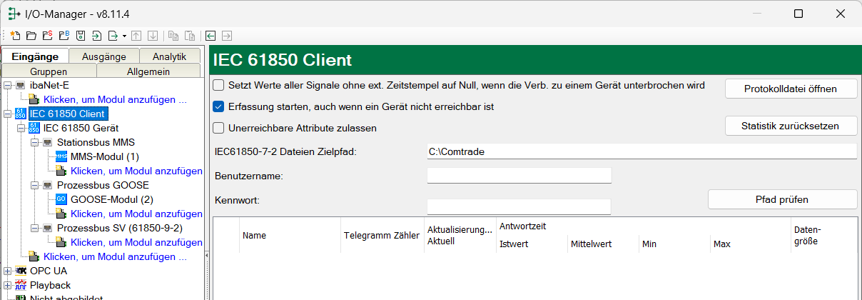 Die Tabelle zeigt verschiedene Diagnosewerte der einzelnen Verbindungen während der Datenerfassung an. Klicken Sie auf die Schaltfläche <Statistik zurücksetzen>, um die berechneten Zeiten und den Fehlerzähler auf null zurückzusetzen. Alle Module eines IEC 61850-Gerätes verwenden dieselbe Verbindung.