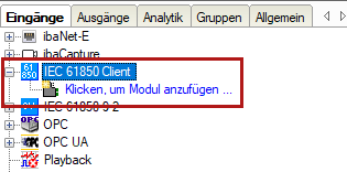 Bei Vorliegen aller Systemvoraussetzungen (siehe Kapitel Systemvoraussetzungen) wird im Signalbaum die Schnittstelle „IEC 61850 Client" angezeigt.