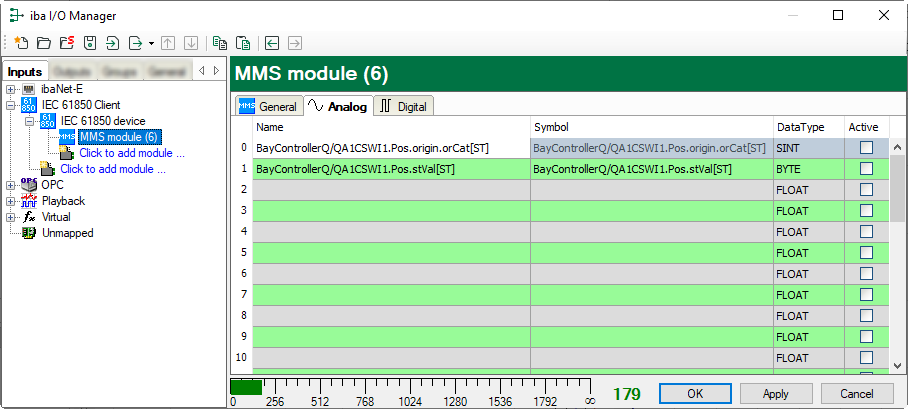 The analog signals to be measured must be entered in the signal tables with the complete name (symbol) and the data type. This is done automatically when selecting via the symbol browser. You can assign any signal name.