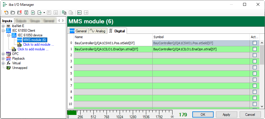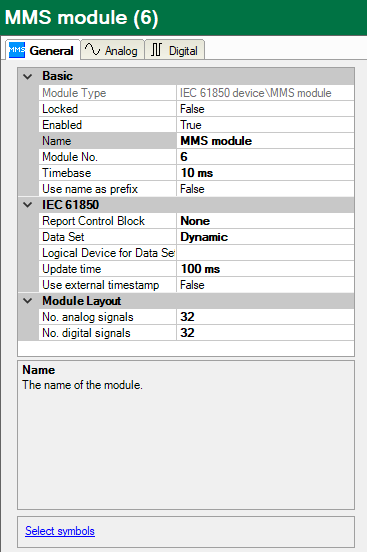 If you open the symbol browser via the hyperlink in the General tab, all available signals are contained there. Depending on whether you select an analog or digital signal in the browser’s signal tree, the Analog or Digital tab will be opened in the background. If you add a signal, it will be inserted in the next open line of the matching signal table.