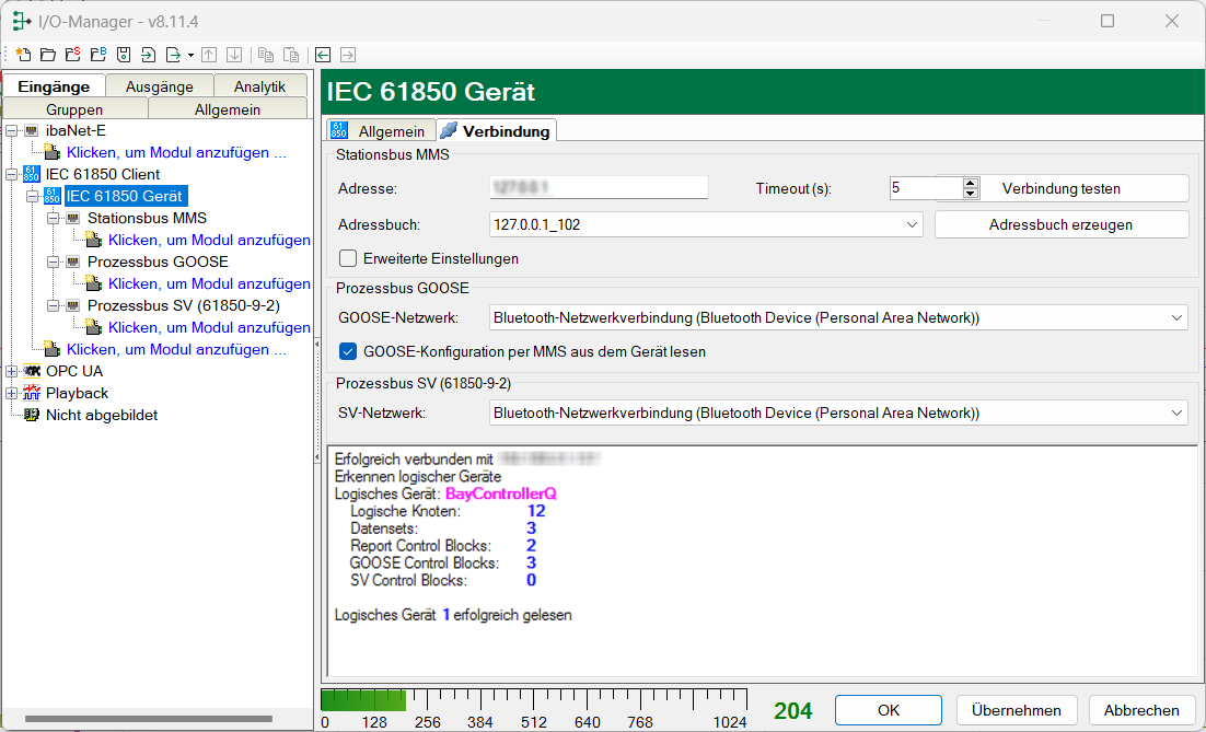 Wenn Sie auf den Button <Verbindung testen> klicken, verbindet sich ibaPDA mit dem IEC 61850-Gerät und lädt das Adressbuch vom Gerät selbst. Der Name des Adressbuchs ist dann die IP-Adresse und Portnummer des Geräts.