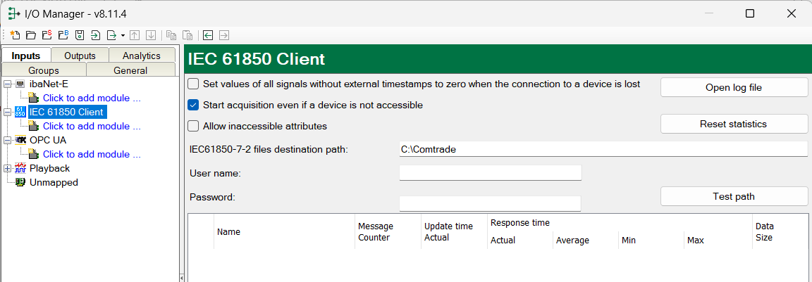 The telegram counter is a continuous counter that is incremented by one with each received telegram. The response time is the time that a device requires to answer a data request. In the case of cyclical transmission, this corresponds to the time to read the data. In the case of MMS reports or GOOSE events, this corresponds to the time between events. The data size is the net data size of the transmitted telegrams.