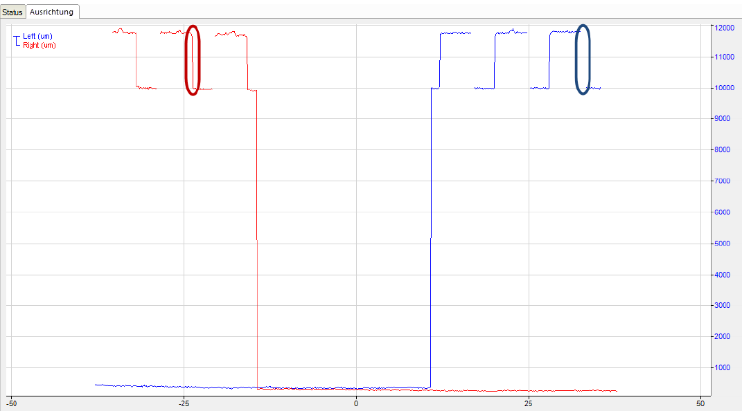 In der oben gezeigten Grafik sind 2 ausgerichtete Sensoren abgebildet; der Wert "X-Offset" ist jedoch noch nicht korrekt eingestellt. Da die Sensoren überlappen, sollten ihre Profile teilweise übereinstimmen. In diesem Beispiel sollten der rot eingekreiste Bereich und der blau eingekreisten Bereich überlappen. Mit Hilfe von Markern kann der Abstand zwischen den beiden Bereichen in der Grafik gemessen werden; dieser Wert kann dann als "X-Offset" für einen der Sensoren genutzt werden. Wenn dieser Wert in die Sensoren-Tabelle eingegeben wird, und dann erneut die Profile abgefragt werden, bekommt man das folgende Ergebnis: