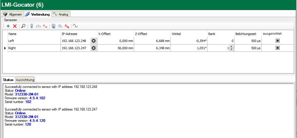 Da die Gocator-Sensoren unabhängig voneinander arbeiten und sich gegenseitig nicht kennen, ist diese Einstellung nicht im Sensor gespeichert.