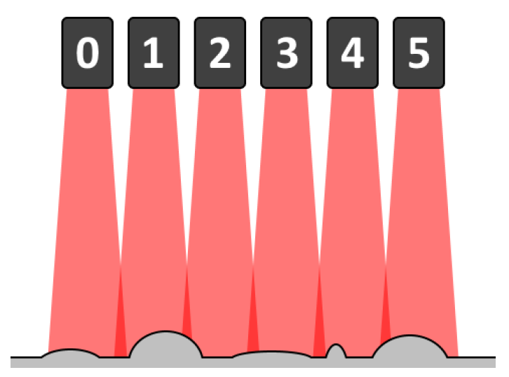 Die Nummer der Bank, der der Sensor zugeordnet ist. Eine Bank ist eine Untergruppe von Sensoren, die eine Laserlinie generieren und gleichzeitig die Profile messen können, ohne sich gegenseitig zu stören. Die folgende Abbildung zeigt eine Anordnung von 6 Sensoren, die einen Gegenstand vermessen: