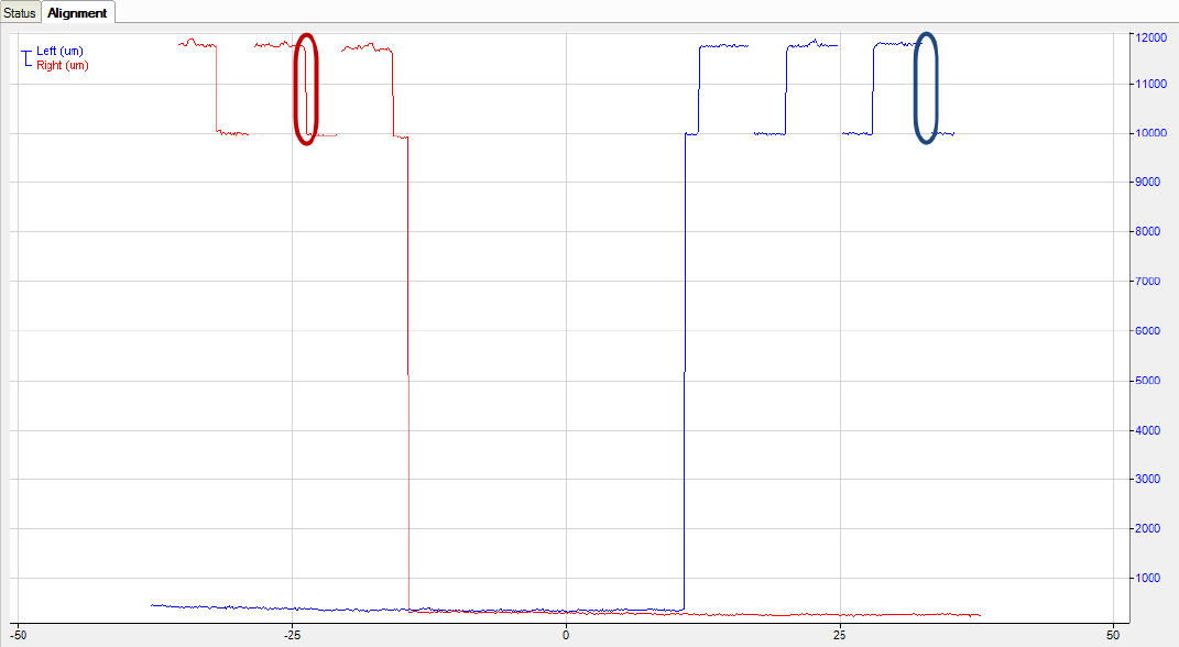 The graphic above shows 2 aligned sensors; however, the "X-Offset" value is not yet set correctly. As the sensors overlap, their profiles should partially match. In this example, the area circled in red and the area circled in blue should overlap. Markers can be used to measure the distance between the two areas in the graphic; this value can then be used as the "X offset" for one of the sensors. If this value is entered in the sensor table and then the profiles are queried again, the following result is obtained: