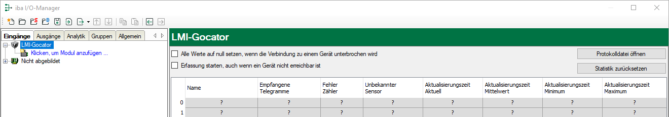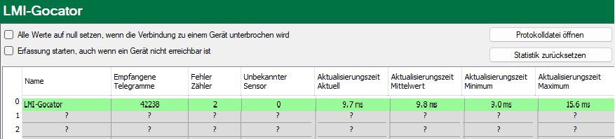 Die Tabelle zeigt die Zykluszeiten und Fehlerzähler der einzelnen Verbindungen während der Datenmessung an. Jede Tabellenzeile entspricht einem konfigurierten Gocator-Modul. Klicken Sie auf den Button <Statistik zurücksetzen>, um die berechneten Zeiten und den Fehlerzähler zurückzusetzen.