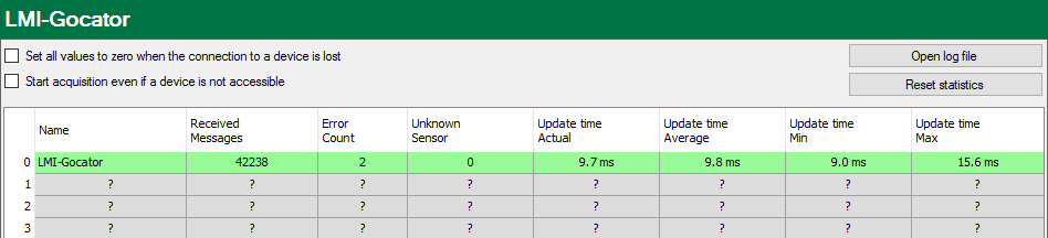 The table shows the cycle times and error counters of the individual connections during data measurement. Each table row corresponds to a configured Gocator module. To reset the calculated times and error counters to zero, simply click on the <Reset statistics> button.