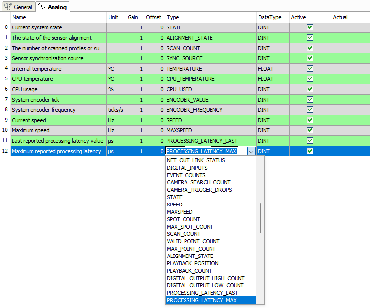The selection list contains all signal types that were known at the time of implementation. Each signal type corresponds to a unique integer value as defined in the LMI-Gocator SDK. A Gocator sensor sends a list of value pairs every second, consisting of an ID (integer value that corresponds to the status signal type) and the actual diagnostic value. ibaPDA goes through this list and checks for each entry whether it should be measured.