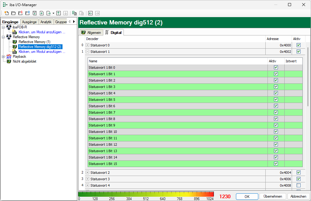 In diese Spalte sind die Offset-Adressen der Signale im Reflective Memory-Speicherbereich einzugeben. Die Standardbelegung kann bzw. muss in der Regel angepasst werden.
