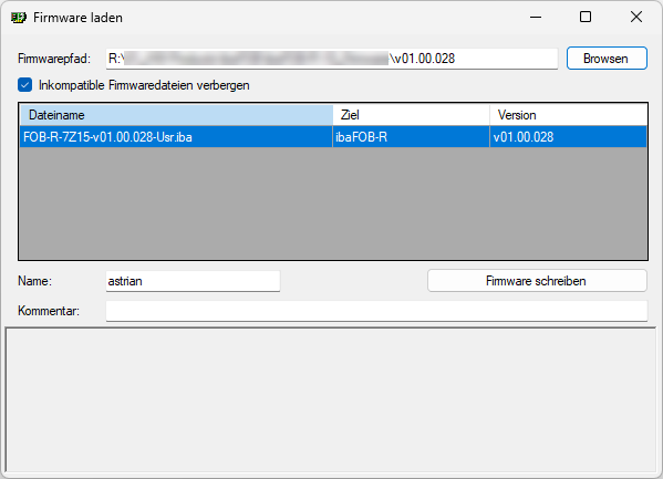 Wenn Sie einen Verzeichnispfad eingeben oder den Button <Durchsuchen> klicken, wird in der Tabelle eine Liste der in diesem Verzeichnis gefundenen Firmware-Dateien angezeigt. In der Tabelle werden der Name der Datei, die Zielkarte und die Firmware-Version angezeigt.