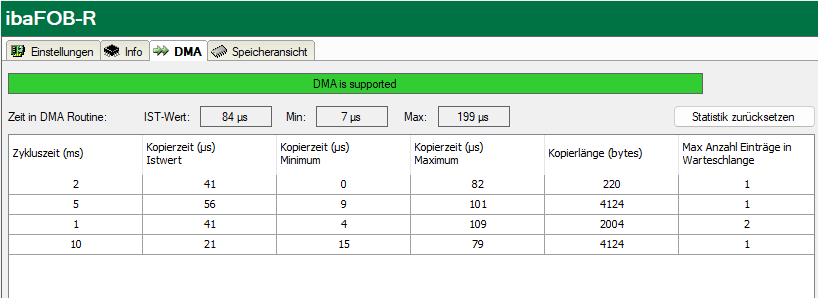 Ist der DMA-Modus aktiviert (siehe Reflective Memory - Register Allgemein), dann werden im Register DMA zu Diagnosezwecken Informationen über den Datenaustausch zwischen der Reflective Memory-Schnittstellenkarte und dem von der ibaPDA-Treibersoftware gelesenen Computerspeicher angezeigt.