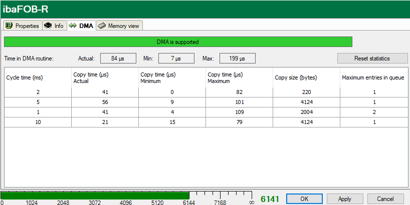 If the DMA mode is enabled (see Reflective Memory – General tab ), you can find in the DMA tab information for diagnostic purposes about the data exchange between between the Reflective Memory interface board and the computer memory read by the ibaPDA driver software.