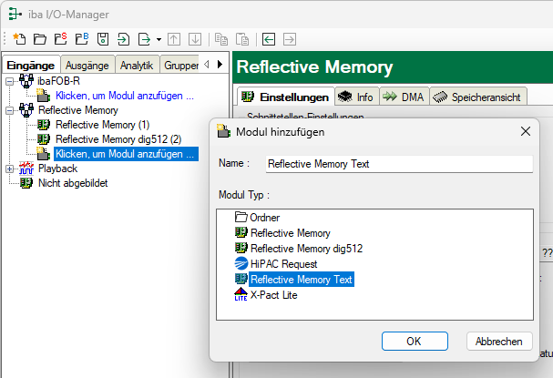Wählen Sie den Modultyp Reflective Memory Text aus und klicken Sie auf <OK>.