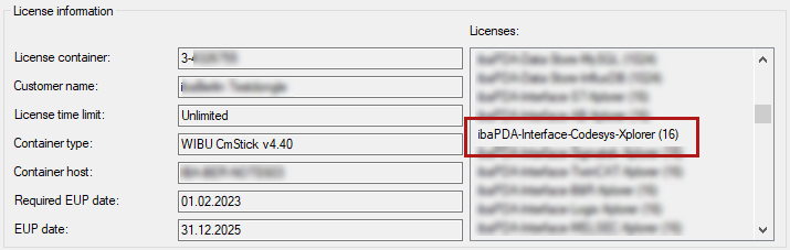 The figure below shows the license for the Codesys Xplorer interface as an example.