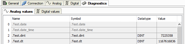 After applying the configuration the actual values of the analog and digital signals are displayed in the Diagnostics tab of the relevant module.