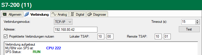 Wenn Sie die Option Projektierten Verbindungen nutzen aktivieren, müssen Sie auch einen Lokalen TSAP und Remote TSAP angeben.
