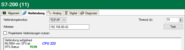 ibaPDA testet die Verbindung zur CPU und zeigt verfügbare Diagnosedaten an.
