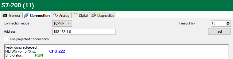 ibaPDA tests the connection to the CPU and displays available diagnostic data.