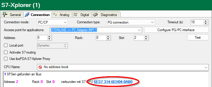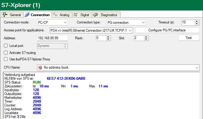 ibaPDA tests the connection to the CPU and displays available diagnostic data.