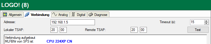 Im Register Verbindung tragen Sie die IP-Adresse der LOGO! in das Feld Adresse ein sowie die in der LOGO! projektierten Lokalen TSAP und Remote TSAP (siehe Konfiguration LOGO!). Klicken Sie auf den Button <Test>.