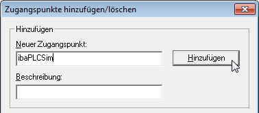 Definieren Sie den neuen Zugangspunkt: Geben Sie einen Namen an, z. B. "ibaPLCSim", und optional eine Beschreibung zum besseren Verständnis. Bestätigen Sie die Eingaben mit <Hinzufügen> und <Schließen>.