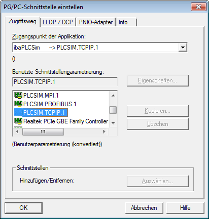 Weisen Sie diesem Zugangspunkt eine Schnittstellenparametrierung zu, z. B. "PLCSIM.TCPIP.1".