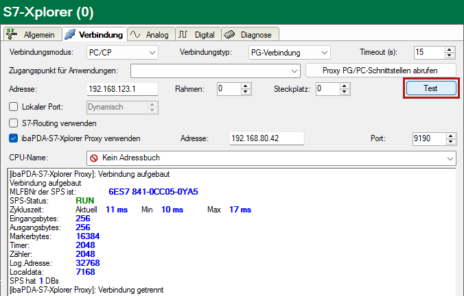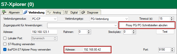 Falls ibaPDA-S7-Xplorer Proxy auf einem anderen Rechner läuft, passen Sie die Adresse entsprechend an und rufen die Proxy PG/PC-Schnittstellen ab.