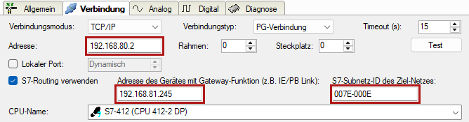 Geben Sie die Adresse der Zielsteuerung an (hier CPU412).