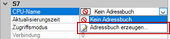 In der Modulkonfiguration im Register Allgemein unter S7 – CPU-Name: Wählen Sie im Drop-down-Menü Adressbuch erzeugen aus.