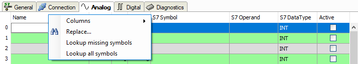 In the Analog and Digital tabs, an additional column S7 Symbol is displayed.