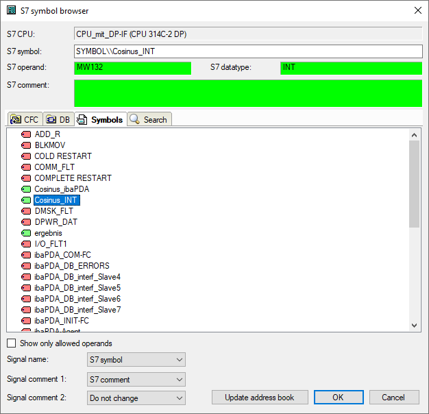 Select Lookup all symbols to search and replace all symbols. The command executes a backward resolution of the S7 symbols out of the S7 operands. ibaPDA searches the symbol table first, then CFC and finally the DBs for the operand.