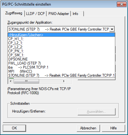 Je nachdem, welche Zugangspunkte im Engineering-Computer konfiguriert wurden, stehen im ibaPDA-System unterschiedliche Zugangspunkte zur Auswahl.