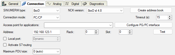 Activate this option if the NCK and the ibaPDA computer are not in the same network, but only communicate over a gateway that supports S7 routing. Such a gateway can be e.g. an IE/PB link, over which the NCK can be reached without an Ethernet connection.