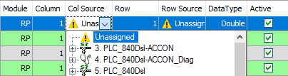 If the option Dynamic addressing is enabled in the General tab, two additional columns are added to the signal grids: Row Source and Col Source.