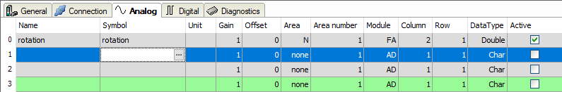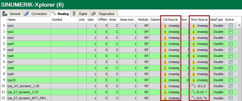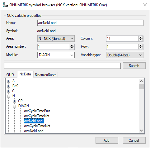 An NCK variable is determined by 5 parameters, which are shown in both the analog and the digital signal grids: Area, Area Number, Module, Column and Row. Each analog variable also has a data type, which is determined by the NCK.